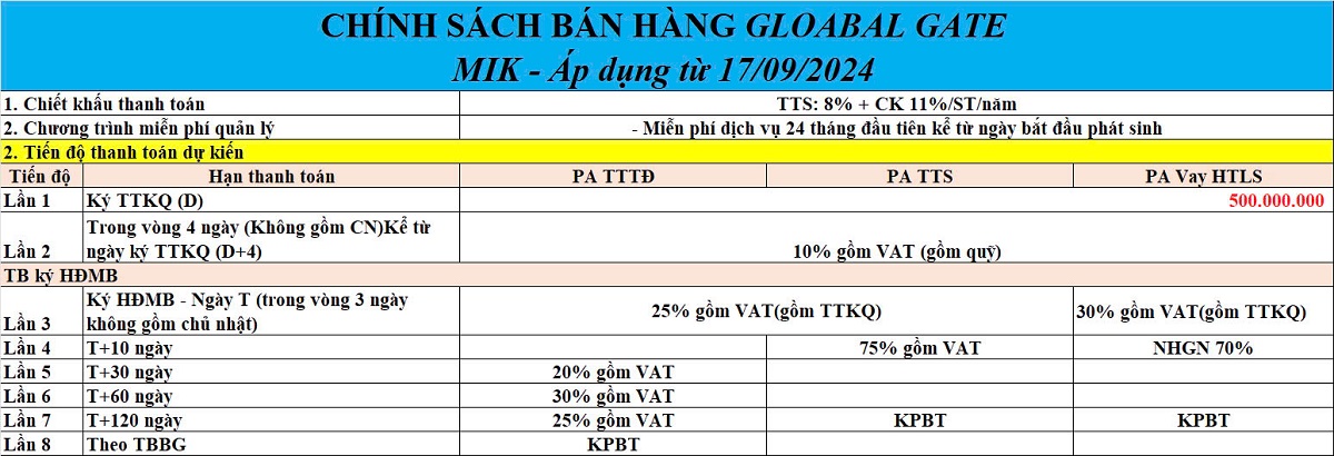 Tiến độ thanh toán dự kiến theo chính sách bán hàng ngày 10/9/2024.